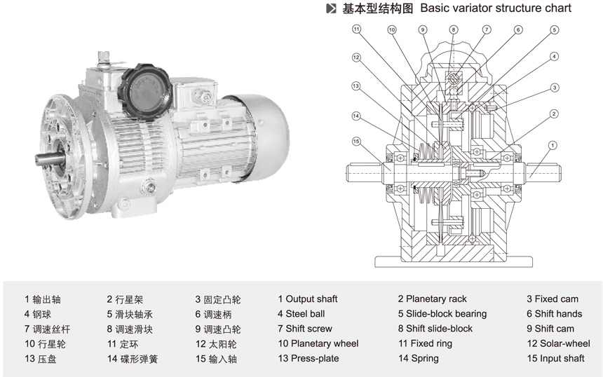 MB無級(jí)變速機(jī)基本結(jié)構(gòu)圖有15個(gè)方面介紹:1、輸出軸 2、行星架 3、固定凸輪 4、鋼球 5、滑塊軸承 6、調(diào)速柄 7、調(diào)速絲桿 8、調(diào)速滑塊 9、調(diào)速凸輪 10、行星輪 11、定環(huán) 12、太陽輪 13、壓盤 14、碟形彈簧 15、輸入軸